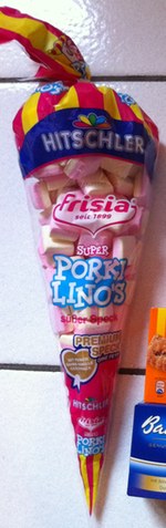 Mein Wahl fiel dieses Jahr auf “Porki Lino’s” von Hitschler. Das ist Premium-Speck aus Stuttgart “mit ein bisschen mehr Liebe im Beutel”. Der Beutel ist wiederverschließbar und knistert nur wenig. Das starke Vanille-Aroma kann die Plastikverpackung indes kaum aufhalten — lang lebe die Lebensmittelchemie.